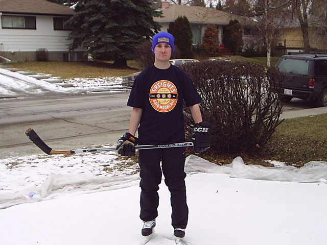 The photo below is of me standing on our rink with my Possum Bourne beanie and Speights T-shirt that my mum sent me. Of course the deep fryer was right in front of me so I couldn’t play hockey that day, but it made for a nice photo ![]()