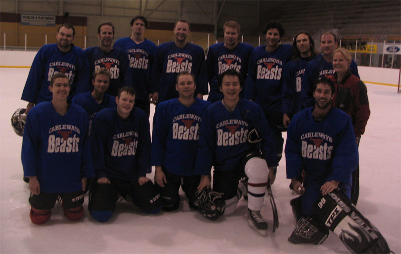 From left to right: Unknown (orange) Ryan Hellyer (me as referee), Kelly Cooper-Mitchell (teal), Hernesha Fakir (orange), Thomas Hedderwick (teal), unknown (red), unknown (teal), Jaclyn Ho (teal), Devon Wallace (teal), Brett Dougherty (orange), Keith Dickson (teal), Sonja Texley (orange), Barett (goalie) Liz Roberts (orane), Chris Laing (teal), unknown (teal), Adam Girardin (goalie), Dave Patchett (orange), unknown (teal), unknown (teal), Devon Wallace (teal), Sophie Soph (orange), Jaydee Cabral (orange). Thanks to Adam Girardin for providing the photo.