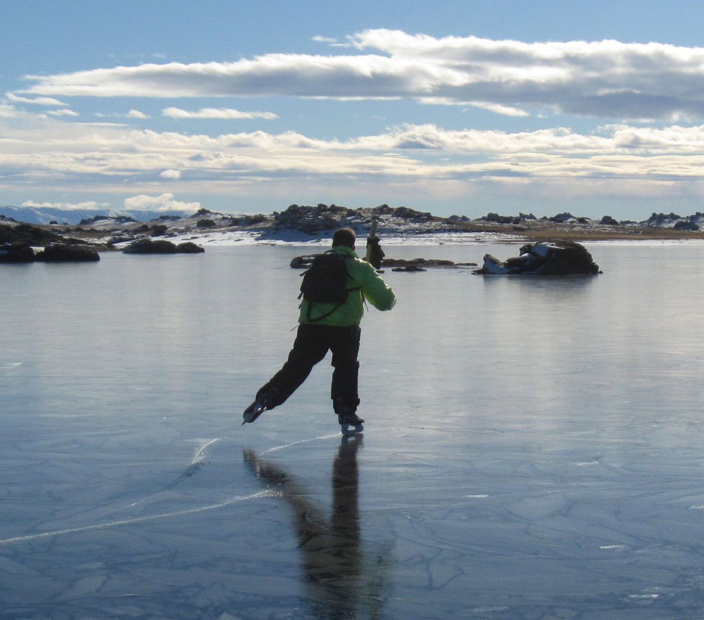 Thanks to Dave Young, Alan Knowles and Dave Patchett for taking me along on their ice skating trip to Central Otago. We had beautiful ice, up to 10 cm thick, at Poolburn Dam. We circumnavigated the entire lake (~20 km), most of which was beautifully smooth near-black ice. There are a lot more photos to come, but here’s a few quick snapshots from the weekends activities until I find the time to process the rest of them.