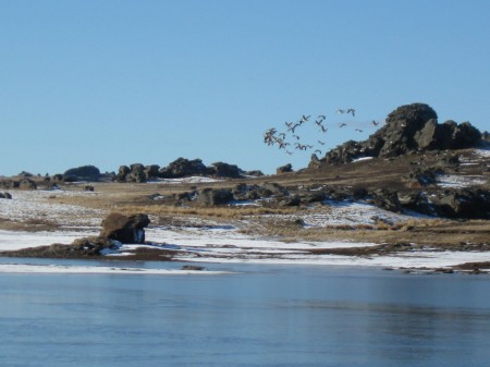 There were a lot of Canadian Geese in the area. Their droppings are somewhat of a hazard on the ice as not only are they large and gross, but they ice tends to melt wherever they land.