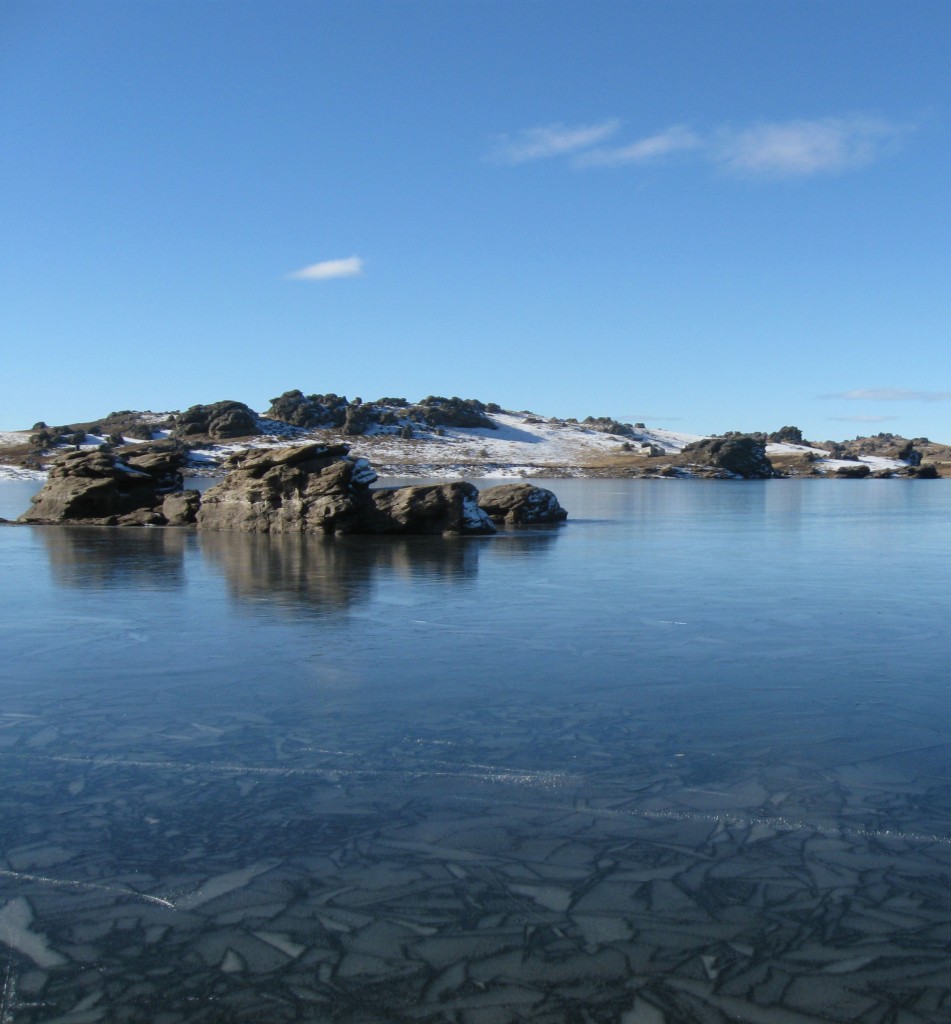 Here you can see the "crazy squares" effect in the ice. The rocks you can see in the background are common throughout the lake and make for a terrific view across the huge expanse of ice.