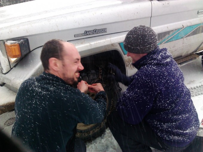On our way back to Dunedin we got caught in a fairly bad snow storm. Lots of cars fallen off the side of the road, a bus full of tourists careering backwards down the Kilmog hill and many silly drivers still attempting to make their way back to Dunedin grossly unprepared. Thankfully Ed’s Landcruiser was well up to the task and after Ed and Dave kindly put the chains on the truck in horrid conditions (whilst I took stood around taking pictures) we had no problems making our way back home.
