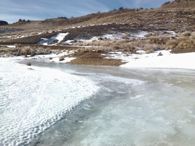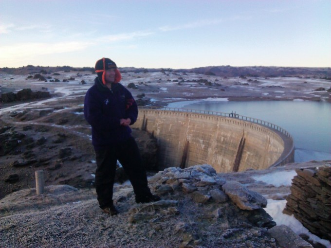 I went camping on the weekend with Ed Waite and Dave Patchett to Poolburn reservoir. We headed off on Friday evening packing tents, as much cold weather gear as we could find and a set of chains in the back Ed’s trusty Toyota Landcruiser. The road up to lake Poolburn was nicely frozen and easy to drive on, apart from a large puddle which Ed decided to travel through instead of around. The puddle was frozen, but apparently not enough to support the weight of a fully laden Toyota Landcruiser but Ed’s ninja awesome four wheel drive skills saved the day and we managed to get out of the ice hole in one piece (sort of …). We found a neat little flat spot perched above the dam where we set up camp with a beautiful view out across the frozen reservoir.